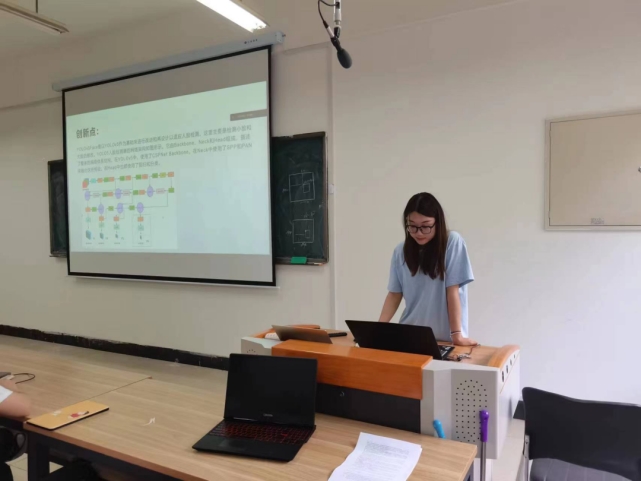 仲新宇同学的汇报题目为“yolov5face”,她首先通过与之前yolov5模型的对比引出了yolov5face这篇论文,随后分享了yolov5face相对于之前模型的改进之处,并且介绍了网络结构,如neck backbone 等结构,最后分享了论文中的实验,验证了yolov5face的创新性和高效性。