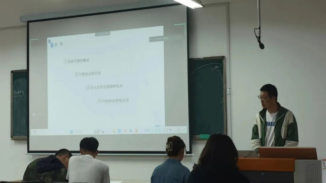 孙入川同学的汇报题目为“系统可靠性分析”,该同学首先对无人机公共安全做背景解读,引出无人机系统可靠性分析必要性,随后介绍传统可靠性分析的几种方法,最后通过解读一篇最新论文详细地介绍了多种方法的融合应用。