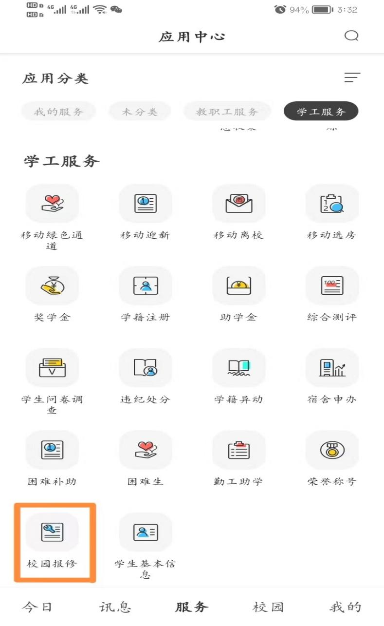 1、登录“今日校园”APP——学工服务——校园报修