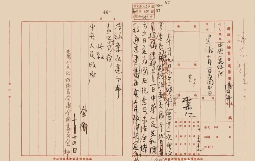 ▼人民政协历史上的第一件建议案:请政府明定10月1日为中华人民共和国国庆日,以代替10月10日的旧国庆日