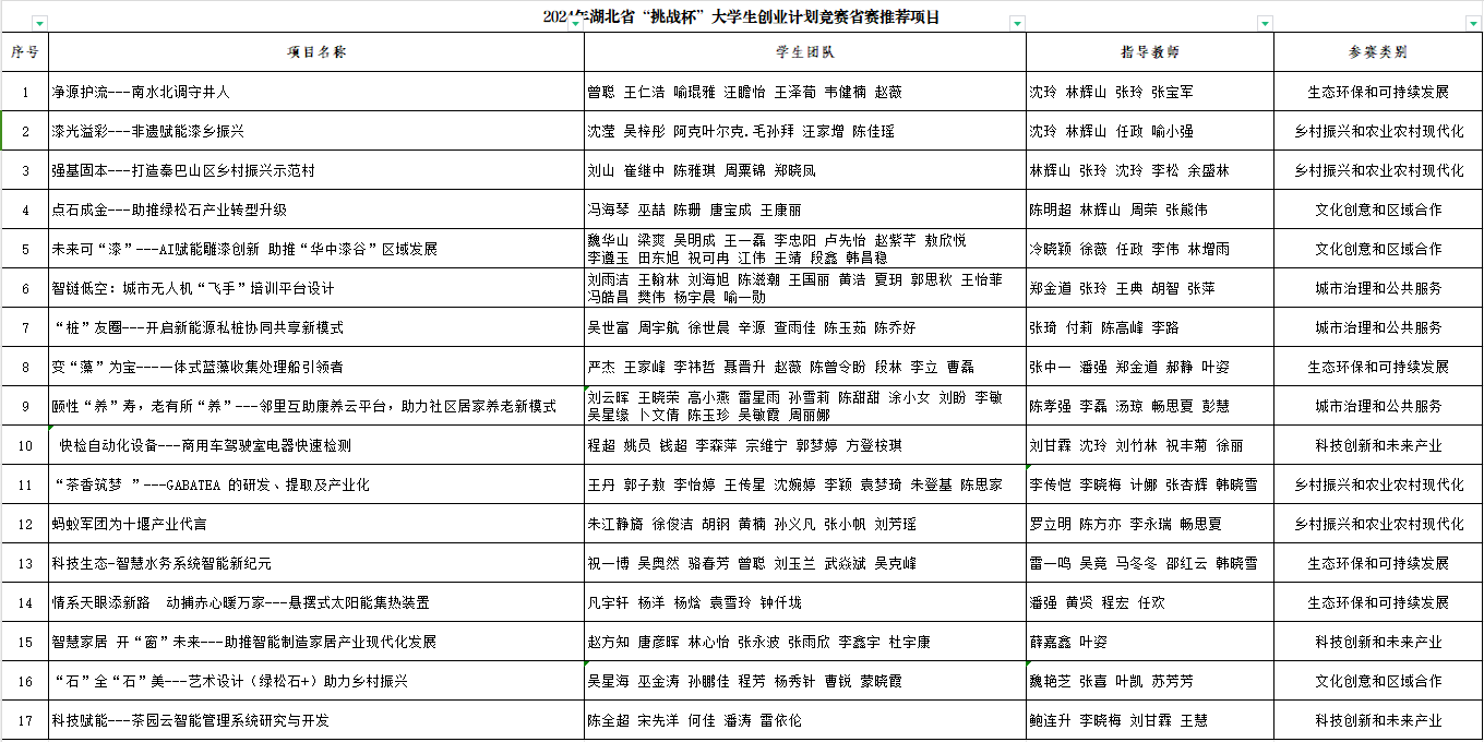 按照《关于举办“创新湖北 青力青为”湖北省第十三届“挑战杯”大学生创业计划竞赛的通知》要求,学校组织开展了2024年“挑战杯”省赛参赛作品申报遴选工作,经过项目申报、资格审查、专家综合评议等环节,拟推荐《科技赋能---茶园云智能管理系统研究与开发》等17件作品参加2024年湖北省“挑战杯”竞赛。