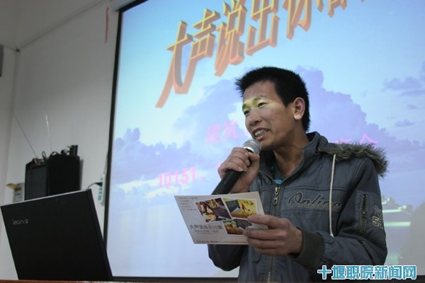 此次活动是响应《十堰晚报》等十家媒体为庆祝三八国际妇女节而发起的“大声说出你的爱”大型公益活动。建筑工程系党总支副书记王厚兵在活动开始前,带领大家回顾了各自寒假里为父母所做的事,进行了“你所了解的父母”问卷调查,并算了一笔“读书账”。随后向在座的同学发放了感恩亲情明信片,同学们纷纷拿出手中的笔,在明信片上写下了自己要对父母说的话,并准备把它寄给父母。在王老师的提议下,大家踊跃上台说出了自己对父母的愧疚以及他们对父母的承诺。同学们还集体朗诵了《学会感激》诗篇,最后在大家合唱的《感恩的心》动人旋律中落下了帷幕。