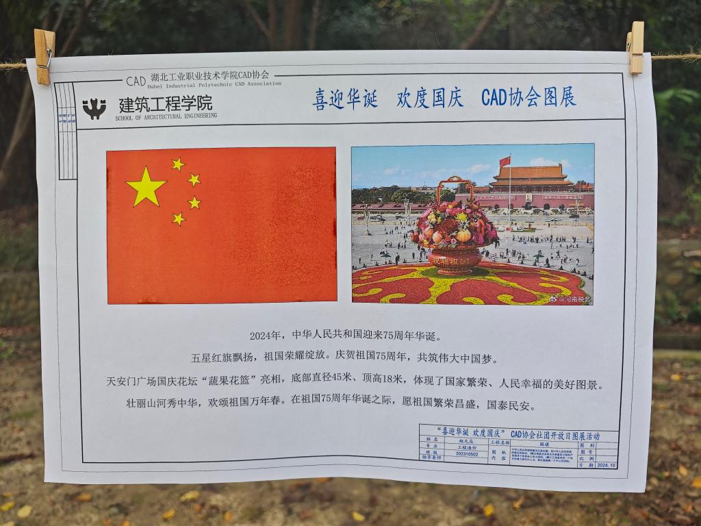 感受匠心之美,铸就青春梦想。10月7日,学生CAD协会“设计美好·描绘未来”图展活动在樱花长廊集中展示了同学们使用 CAD 软件绘制的《五星红旗》《天安门城楼》《山东曲阜孔庙碑亭》等作品,以专业技艺和青春风采向祖国母亲献礼;学生无人机科技协会“逐梦长空”无人机飞行体验为同学们提供一个接触和体验无人机的机会,感受航飞的快乐。10月3日学生3D创行者协会“印刻我的中国心”活动,让参与的同学们充分感受激光雕刻的工业浪漫与3D打印技术的魅力。