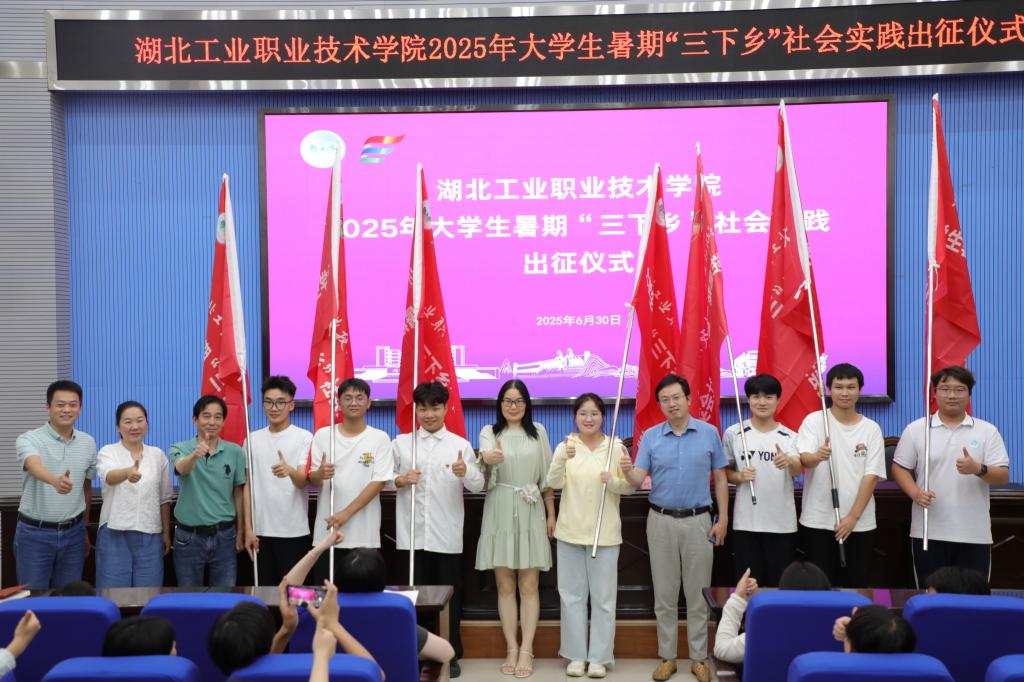 最后,与会领导为实践团队授旗。鲜红的旗帜高高飘扬,象征着责任与使命,也寄托着学校的殷切期望。同学们纷纷表示,将不负重托,以饱满的热情和扎实的作风投身实践,在基层大地上书写属于湖工职院学子的青春华章。