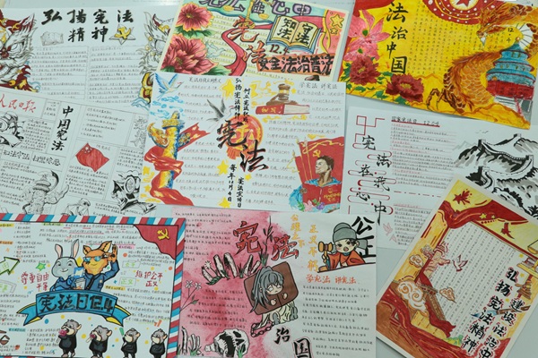 活动筹备阶段,通过线上线下结合的方式进行了广泛动员宣传,面向全校学生征集作品,共吸引全校400余名学生报名参与。创作过程中,同学们主动查阅宪法典籍、梳理法治案例,深入钻研宪法历史发展脉络、核心条款内涵及公民权利义务等关键内容,并运用漫画、书法、插图、手工装饰等多种形式,将抽象的宪法知识转化为具象的视觉作品。一幅幅作品主题鲜明、构思精巧、图文并茂,既展现了扎实的宪法知识储备,也彰显了新时代青年学子的创意活力与法治思考。