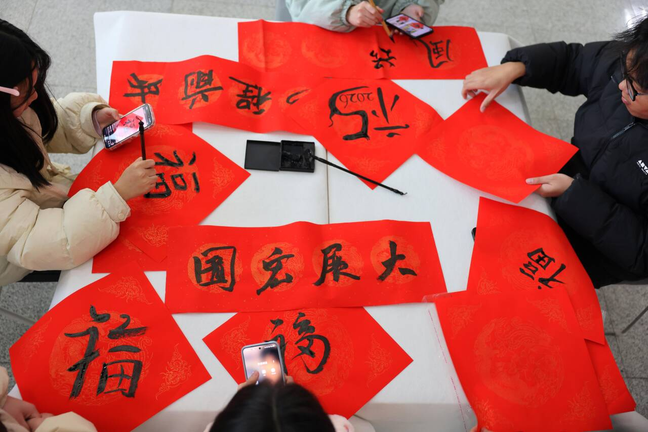 学生社团凤凰灯社成员带来的《舞狮迎新春》表演金狮腾跃生风,鼓乐铿锵激越。学生非遗协会成员们手持红纸与剪刀,巧手翻飞间红纸绽出锦绣纹样,为这场传统文化技艺的交响增添了灵动的韵律。