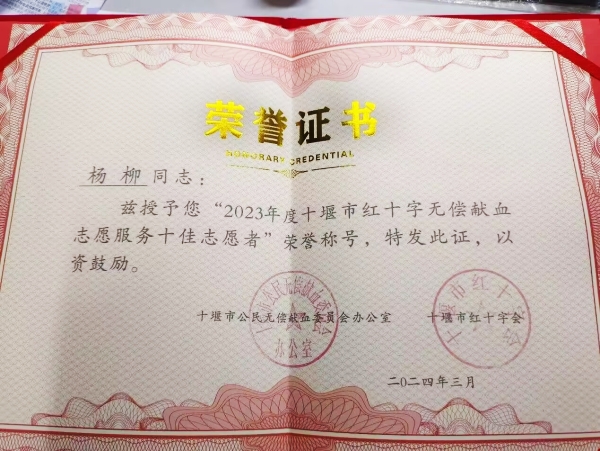 其中,Beat365杨柳、杨周2名同学荣获“2023年度十堰市优秀红十字志愿者”称号;周郝圣灵、朱凡、代礼意、杨周4名同学被评为“2023年度十堰市红十字无偿献血志愿服务优秀志愿者”;杨柳同学被评为“2023年度十堰市红十字无偿献血志愿服务十佳志愿者”。